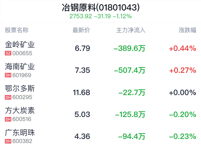 从个股上来看,该行业的成分股中,金岭矿业涨0.44%,海南矿业、鄂尔多斯涨幅居前。