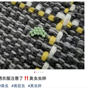 臭屁虫的卵多产于叶背,还有少数卵产在枝梢、树干以及树体以外。如果你家附近有果树,且天气比较潮湿的话,晾晒衣服时就要注意了!