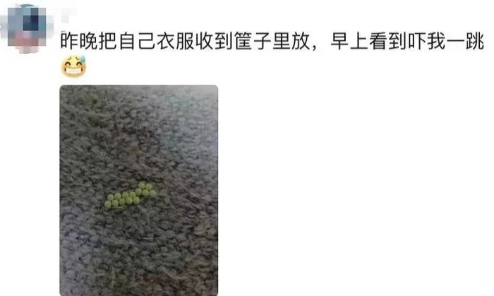 要提醒大家的是,收衣服的时候,要小心了!很多网友在收衣服时发现衣服上面粘附着奇怪的绿色小颗粒,排得整整齐齐——