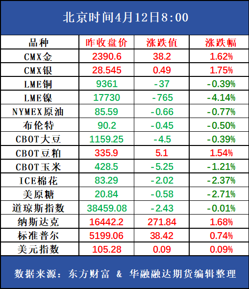 昨日美国劳工部发布的3月美国CPI数据显示,美国3月消费者价格指数(CPI)环比增长0.4%,预期值为0.3%;同比增长3.5%,预期值为3.4%。其中,住房和汽油指数上升,共同对整体项目月度上涨贡献了超过一半的份额。市场对于美联储的降息预期有所降温,美元指数强势上涨,商品市场普跌,昨日美棉期价触及85美分/磅。近期美棉期价持续下跌令内外棉价差趋窄,不利于国内棉花的消耗。