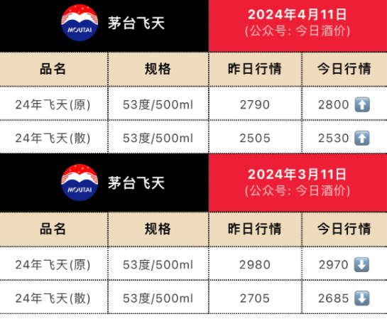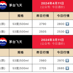 而此前3月11日,原箱飞天茅台为2970元/瓶,散瓶飞天茅台每瓶价格为2685元/瓶。一个月内原箱和散瓶飞天茅台的降幅分别为170元和155元。