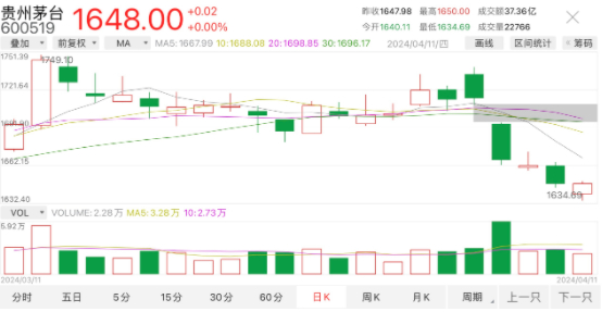 股价方面,贵州茅台4月11日收盘价1648元/股,盘中一度跌至1634.69元/股。自3月11日以来,茅台一直在1700元/股附近徘徊,股价一度在3月12日达到1749.1元/股。