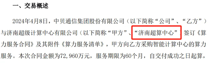 4月11日,国家超级计算济南中心发布声明称,近期,中贝通信发布《关于签订算力服务合同的公告》,合同内容显示“中贝通信集团股份有限公司与济南超级计算中心有限公司签订《算力服务合同》及其附件《算力服务清单》,甲方向乙方采购智能计算中心的算力服务”,该合同与国家超级计算济南中心无关。