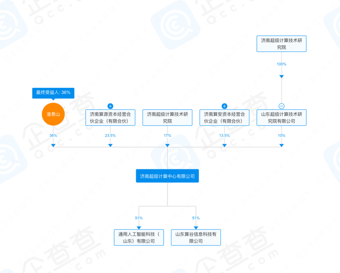 企查查显示,济南超级计算中心有限公司成立于2021年5月,是一家以从事互联网和相关服务为主的企业,注册资本2000万元,法定代表人为涂阳。股东信息显示,该公司共有5名股东,分别为:潘景山持股36%,济南算源资本经营合伙企业(有限合伙)持股23.5%,济南超级计算技术研究院持股17%,济南算安资本经营合伙企业(有限合伙)持股13.5%,山东超级计算技术研究院有限公司持股10%。进一步查询,济南超级计算技术研究院全资持股山东超级计算技术研究院有限公司,法定代表人是潘景山。