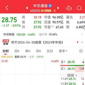 4月12日,中贝通信(603220.SH)低开近7%,截至午盘,中贝通信报28.75元/股,跌幅3.91%,市值96.38亿元。