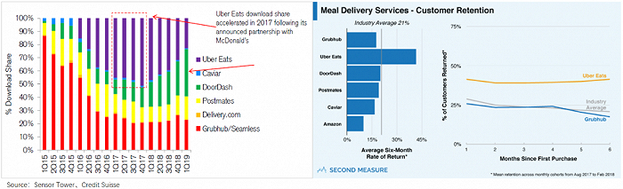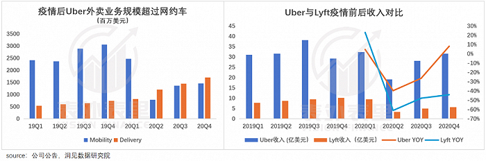 此情此景下,相比只有出行板块的Lyft,Uber“两条腿走路”的优势就凸显出来了——打外卖这张牌。