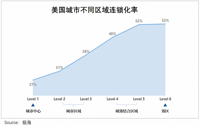 而当时的美国餐饮市场早已成熟,连锁化率将近55%,呈现出“逆连锁化”特征——越是郊区、小城市,连锁门店越多。
