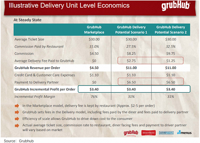 2015年,GrubHub曾试图自建外送团队,并测算了这种模式下的盈利能力——利润率从76%降到31%。