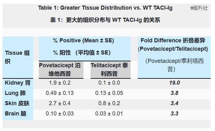 另外,从Povetacicept药力分布数据可以看出,Povetacicept在肾脏的分布是泰它西普的19倍,在皮肤中的分布是泰它西普的3.4倍,这意味着Povetacicep可能在IgA肾病、系统性红斑狼疮等疾病中拥有比泰它西普更好的疗效。