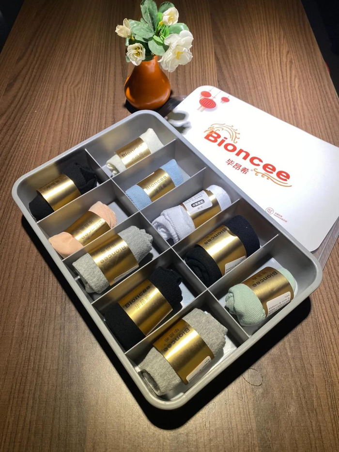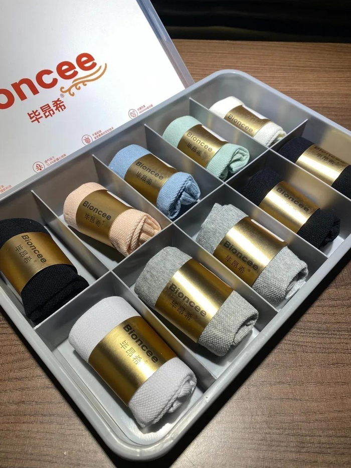 BIONCEE-7A金银花精油抑菌袜,每一双都是采用的200针纱线织造,细腻紧密,脚踩在平地上的感觉比打赤脚还舒服。