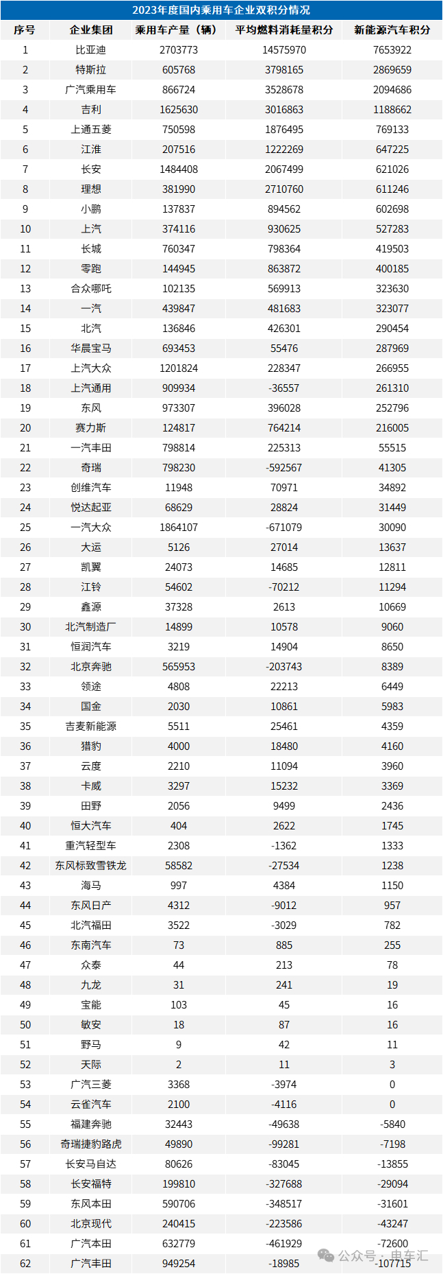 2023年度国内乘用车企业双积分详细情况统计表: