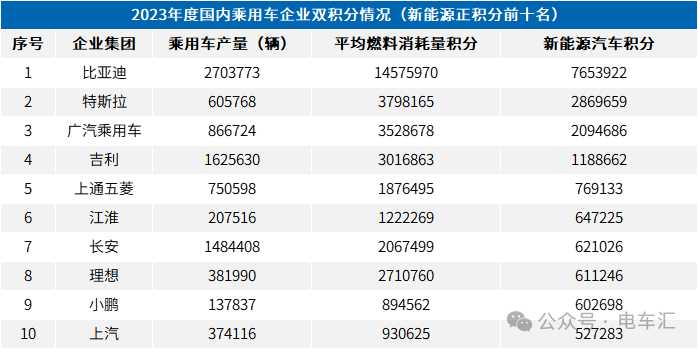2023年新能源正积分数量前十名车企