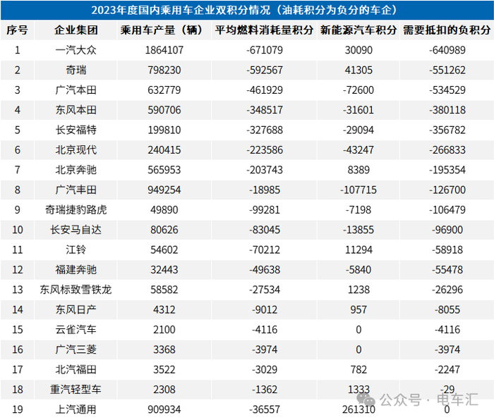 2023年油耗积分为负分的车企