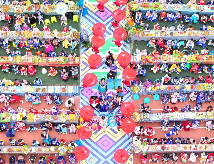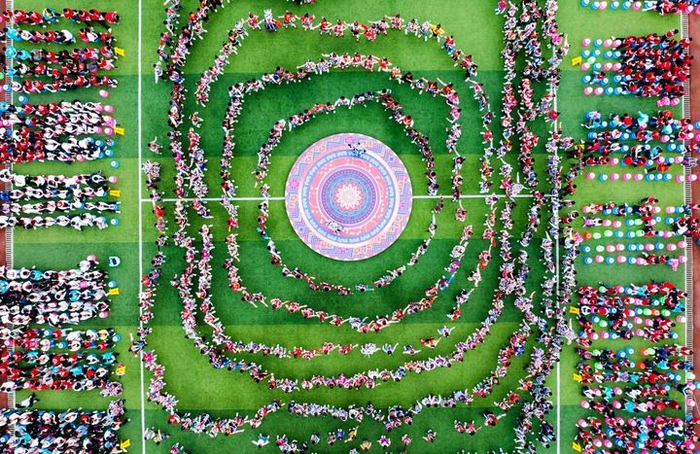 ▲4月8日,在广西柳州市融水苗族自治县融水镇苗家小镇小学,师生载歌载舞(无人机照片)。连日来,广西各地举办庆祝活动,喜迎“三月三”传统佳节。新华社发(龙涛 摄)