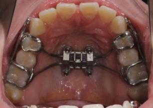 这是一种通过粘接在牙齿上固位的固定式扩弓方式。通过扩弓能够有效地打开腭中缝,随后腭中缝会被新生骨慢慢填满,它适用恒双尖牙已萌出的青少年。