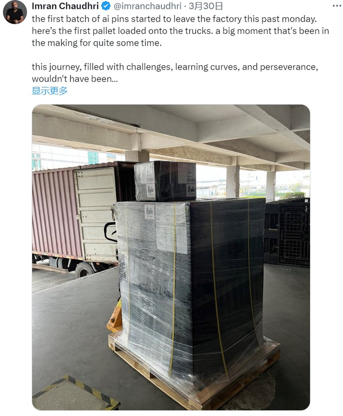 Imran也在3月30日发布动态称,首批AI Pin已经完成生产,正在装上卡车。公司也透露,之前预定的用户可以从4月中旬开始陆续拿到产品。