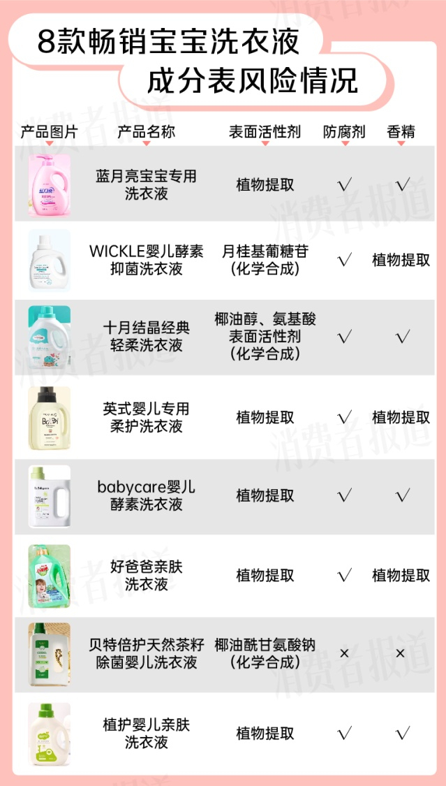 为此,消费者报道挑选了目前市场上八款畅销产品,涉及蓝月亮、WICKLE、十月结晶、英式、babycare、好爸爸、贝特倍护、植护等品牌(排名不分先后)。记者通过观察成分表以及咨询客服发现,WICKLE、十月结晶、贝特倍护的洗衣液表面活性剂为化学合成物,由于中国洗衣液国标并不强制包装上标注洗衣液的具体成分,上述品牌客服均表示产品成分为研发配方,属于商业机密,不对外开放。