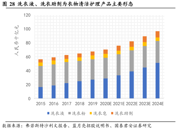 在报告中,国泰君安称,2019年,衣物清洗市场规模为678亿元,2015—2019年的复合年增长率为4.8%。其中,洗衣液和洗衣助剂增长较快。预计2024年,衣物清洗市场规模将达到971亿元,洗衣液市场规模达515亿元。