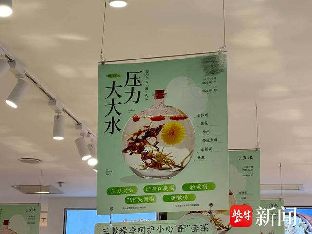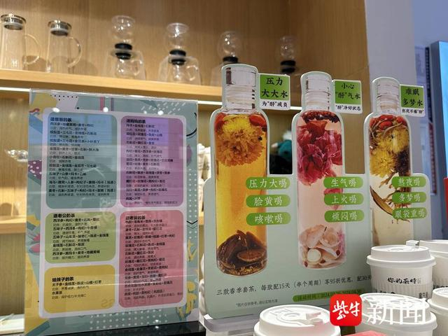 压力大大水、难眠多梦水、小心“酐”气水、湿拜拜茶……近日,一家开在南京城北万象汇专门售卖散称花草茶的店里有不少市民驻足品尝,也吸引了记者的注意。店里琳琅满目摆满了小几十种花草、中药材可以散称搭配。例如“压力大大水”就是金线莲、桂花、枸杞、婺源皇菊、金银花、甘草配在一起,广告语上写着“压力大喝、口苦口臭喝、脸黄喝、‘酐’失调喝、咳嗽喝”。