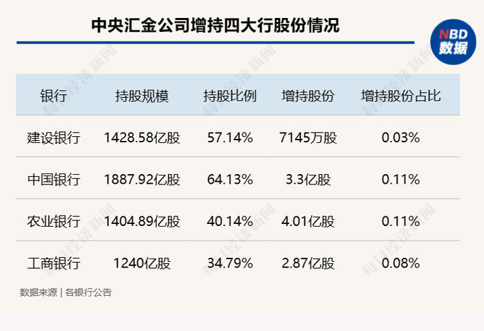 建设银行方面,截至4月10日,中央汇金公司通过上海证券交易所交易系统累计增持建设银行A股股份7145万股,约占该行总股本的0.03%;中央汇金公司共持有该行股份1428.58亿股(其中A股2.67亿股,H股1425.9亿股),约占该行总股本的57.14%。