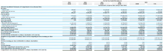 年报显示,理想汽车2020年、2021年、2022年、2023年营收分别为94.57亿元、270亿元、452.87亿元、1238.5亿元(约174.44亿美元);运营利润分别为-6.69亿元、-10.17亿元、-36.55亿元、74亿元(约10.43亿美元);净利分别为-1.52亿元、-3.21亿元、-20.32亿元、118.09亿元(约16.63亿美元)。