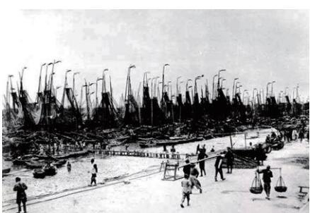 上海地区河网纵横,水运便捷,西晋以前,吴淞江入海口已有渔业生产和水上军事活动,或渔港,或军港。然就商港而言,萌动于晋代,兴起于隋唐,成型于北宋。北宋朝廷设立“上海务”榷酒税的机构,上海浦边逐渐趋向兴旺,港口位置也逐渐向海口迁移,间有海船停泊于上海浦,越百年,遂成人烟密集、海舶辐辏的港口市镇。宋代上海建镇并设置市舶提举分司,港与城同步形成,并名列全国七个水路口岸之一。“港市”的雏形已经出现了。