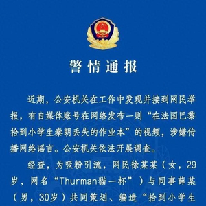 杭州市公安局西湖区分局4月12日通报:近期,公安机关在工作中发现并接到网民举报,有自媒体账号在网络发布一则“在法国巴黎拾到小学生秦朗丢失的作业本”的视频,涉嫌传播网络谣言。公安机关依法开展调查。