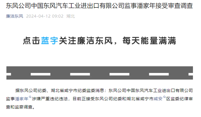 据东风公司纪委、湖北省咸宁市纪委监委消息:东风公司中国东风汽车工业进出口有限公司监事潘家年涉嫌严重违纪违法,目前正接受东风公司纪委和湖北省咸宁市咸安区监委纪律审查和监察调查。