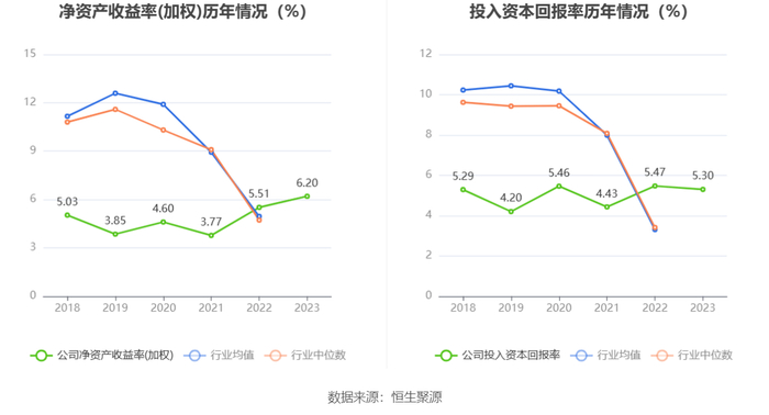 数据显示,2023年公司加权平均净资产收益率为6.20%,较上年同期增长0.69个百分点;公司2023年投入资本回报率为5.30%,较上年同期下降0.17个百分点。