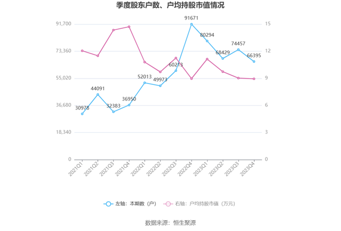 筹码集中度方面,截至2023年年末,公司股东总户数为6.64万户,较三季度末下降了8062户,降幅10.83%;户均持股市值由三季度末的9.03万元下降至8.95万元,降幅为0.89%。