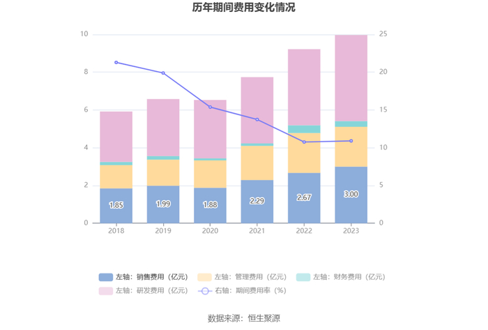 2023年,公司期间费用为9.97亿元,较上年同期增加7536.35万元;期间费用率为10.91%,较上年同期上升0.15个百分点。其中,销售费用同比增长12.42%,管理费用同比增长0.21%,研发费用同比增长13.14%,财务费用同比下降27.09%。