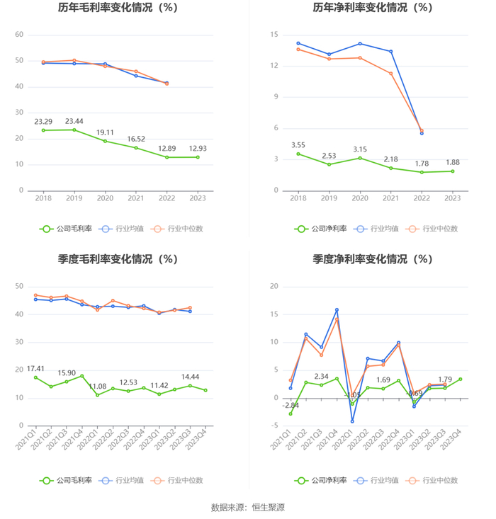 2023年,公司毛利率为12.93%,同比上升0.04个百分点;净利率为1.88%,较上年同期上升0.10个百分点。从单季度指标来看,2023年第四季度公司毛利率为12.83%,同比下降0.84个百分点,环比下降1.61个百分点;净利率为3.41%,较上年同期上升0.26个百分点,较上一季度上升1.62个百分点。