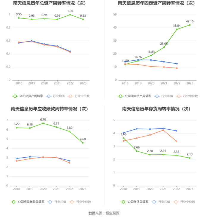 营运能力方面,2023年,公司公司总资产周转率为0.93次,上年同期为1.00次(2022年行业平均值为0.44次,公司位居同行业7/103);固定资产周转率为42.15次,上年同期为38.84次(2022年行业平均值为12.57次,公司位居同行业21/103);公司应收账款周转率、存货周转率分别为4.60次、2.13次。