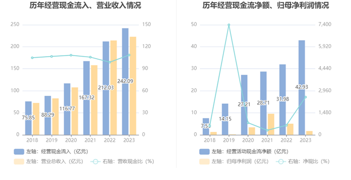 2023年,公司经营活动现金流净额为42.93亿元,同比增长34.23%;筹资活动现金流净额8.61亿元,同比减少34.05亿元;投资活动现金流净额-48.68亿元,上年同期为-71.96亿元。