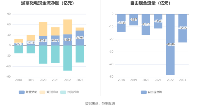 进一步统计发现,2023年公司自由现金流为-22.55亿元,上年同期为-48.46亿元。