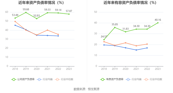 在偿债能力方面,公司2023年年末资产负债率为57.87%,相比上年末下降1.27个百分点;有息资产负债率为40.16%,相比上年末上升5.86个百分点。