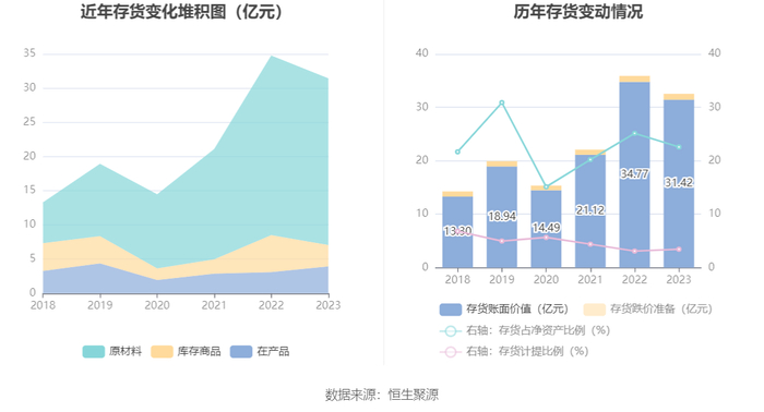 从存货变动来看,截至2023年年末,公司存货账面价值为31.42亿元,占净资产的22.58%,较上年末减少3.34亿元。其中,存货跌价准备为1.12亿元,计提比例为3.45%。