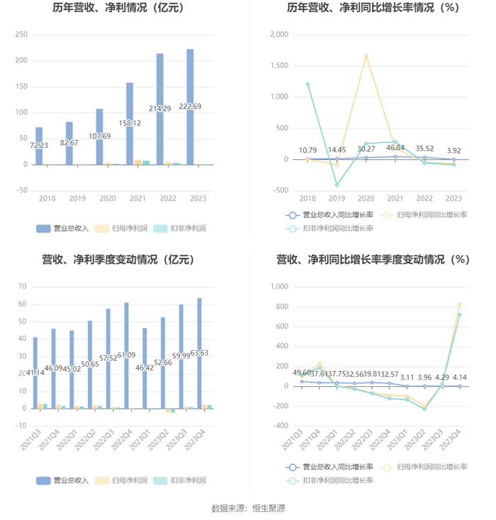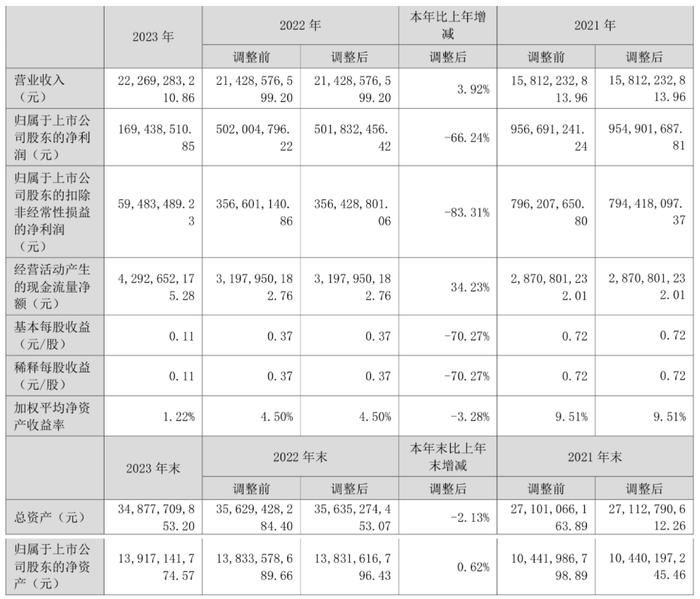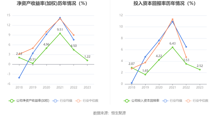 数据显示,2023年公司加权平均净资产收益率为1.22%,较上年同期下降3.28个百分点;公司2023年投入资本回报率为2.52%,较上年同期下降1.01个百分点。