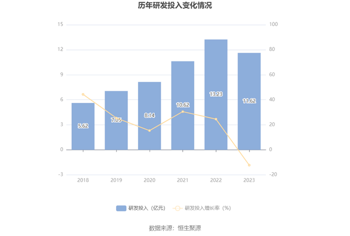 2023年全年,公司研发投入金额为11.62亿元,同比下降12.21%;研发投入占营业收入比例为5.22%,相比上年同期下降0.95个百分点。此外,公司全年研发投入资本化率为0。