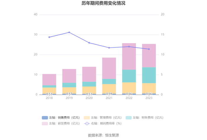 2023年,公司期间费用为25.38亿元,较上年同期减少3719.03万元;期间费用率为11.40%,较上年同期下降0.62个百分点。其中,销售费用同比增长0.76%,管理费用同比下降6.79%,研发费用同比下降12.21%,财务费用同比增长25.46%。