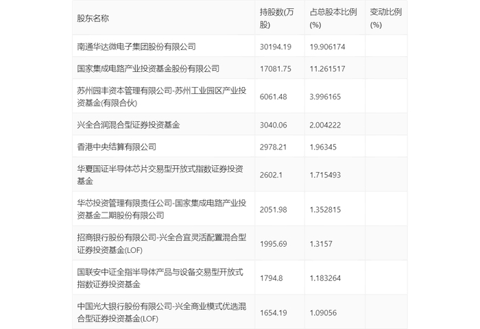 年报显示,2023年年末公司十大流通股东中,新进股东为兴全合润混合型证券投资基金、招商银行股份有限公司-兴全合宜灵活配置混合型证券投资基金(LOF)、中国光大银行股份有限公司-兴全商业模式优选混合型证券投资基金(LOF),取代了三季度末的国泰CES半导体芯片行业交易型开放式指数证券投资基金、华安媒体互联网混合型证券投资基金、东方红睿泽三年定期开放灵活配置混合型证券投资基金。在具体持股比例上,香港中央结算有限公司持股有所上升,南通华达微电子集团股份有限公司、国家集成电路产业投资基金股份有限公司、苏州园丰资本管理有限公司-苏州工业园区产业投资基金(有限合伙)、华夏国证半导体芯片交易型开放式指数证券投资基金、华芯投资管理有限责任公司-国家集成电路产业投资基金二期股份有限公司、国联安中证全指半导体产品与设备交易型开放式指数证券投资基金持股有所下降。