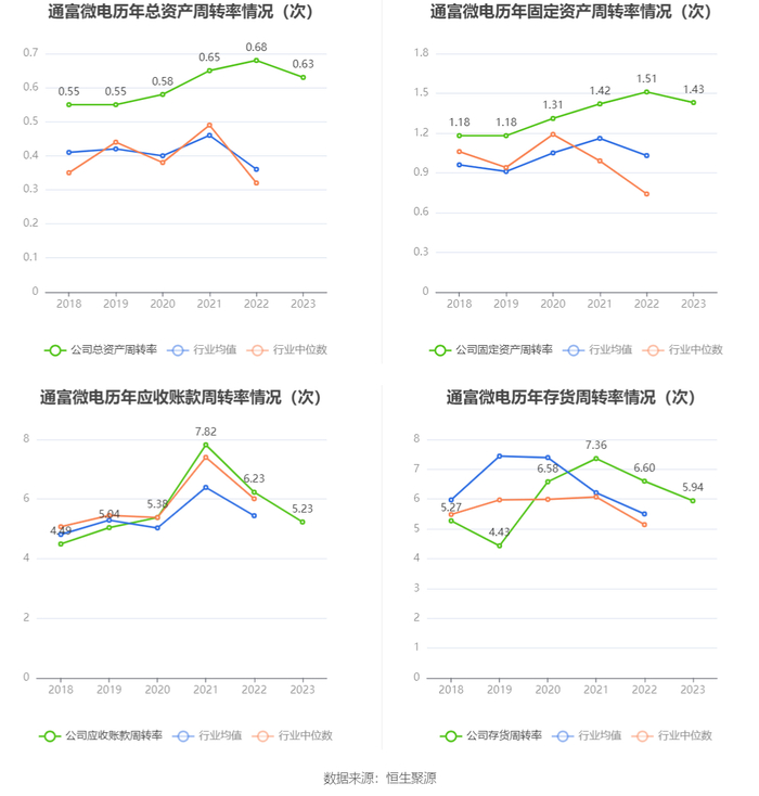 营运能力方面,2023年,公司公司总资产周转率为0.63次,上年同期为0.68次(2022年行业平均值为0.36次,公司位居同行业2/13);固定资产周转率为1.43次,上年同期为1.51次(2022年行业平均值为1.03次,公司位居同行业4/13);公司应收账款周转率、存货周转率分别为5.23次、5.94次。