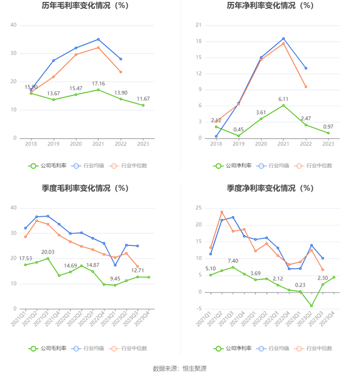 2023年,公司毛利率为11.67%,同比下降2.23个百分点;净利率为0.97%,较上年同期下降1.50个百分点。从单季度指标来看,2023年第四季度公司毛利率为12.63%,同比上升2.89个百分点,环比下降0.08个百分点;净利率为4.43%,较上年同期上升3.78个百分点,较上一季度上升2.13个百分点。