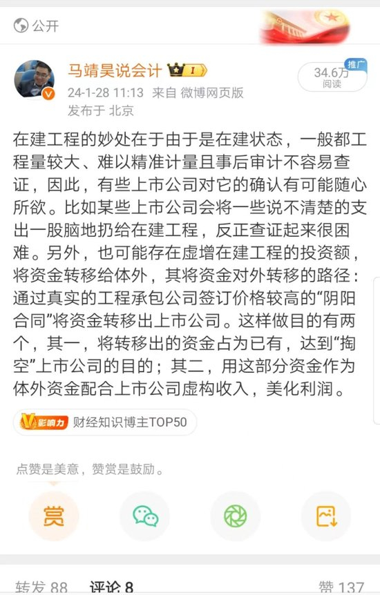 马靖昊:奇信股份的财务造假就是充分利用了该科目。它从在建工程中洗出的资金在回流企业时,增加经营活动的现金流量的同时,也形成了一个巨大的“资产黑洞”。