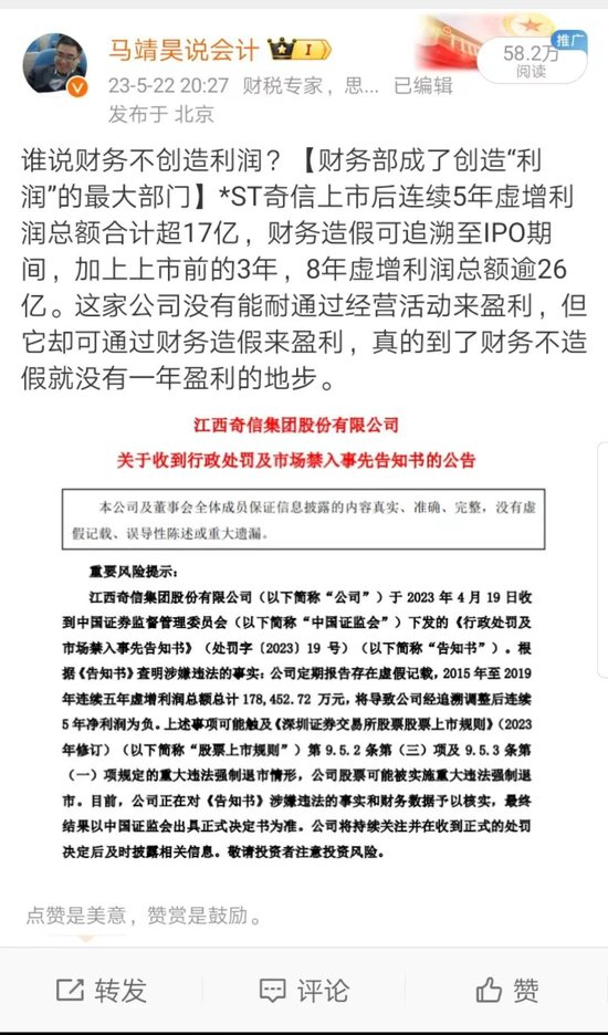 谁说财务不创造利润?【财务部成了创造“利润”的最大部门】*ST奇信上市后连续5年虚增利润总额合计超17亿,财务造假可追溯至IPO期间,加上上市前的3年,8年虚增利润总额逾26亿。这家公司没有能耐通过经营活动来盈利,但它却可通过财务造假来盈利,真的到了财务不造假就没有一年盈利的地步。