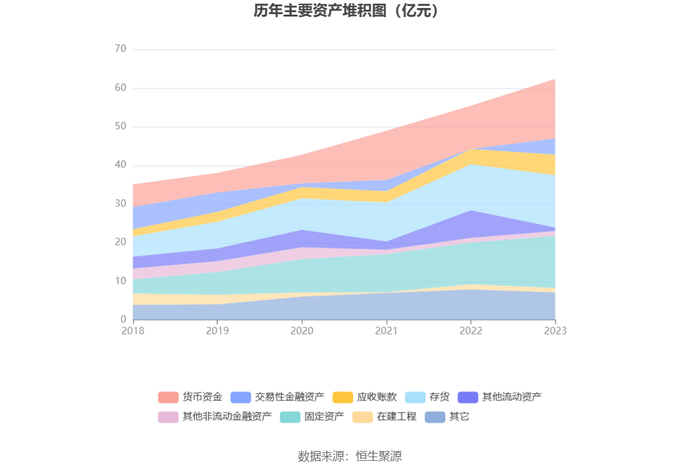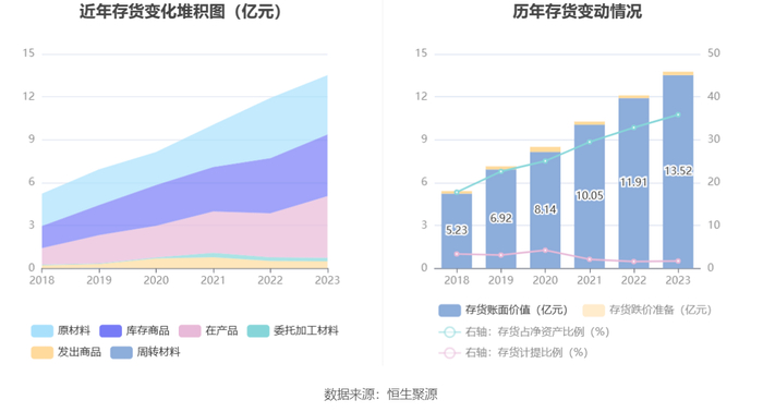 从存货变动来看,截至2023年年末,公司存货账面价值为13.52亿元,占净资产的35.84%,较上年末增加1.61亿元。其中,存货跌价准备为2369.17万元,计提比例为1.72%。