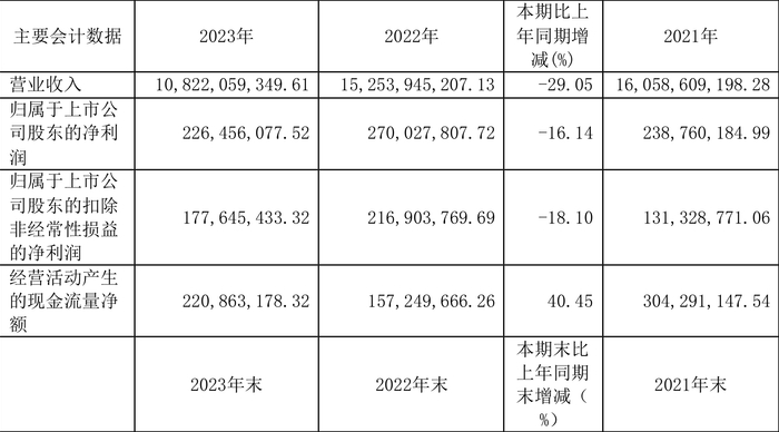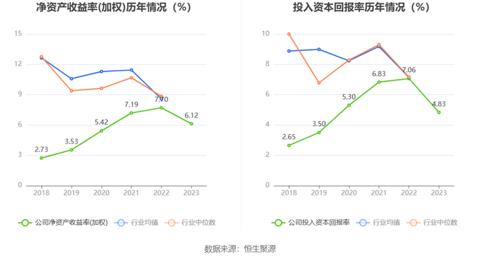 数据显示,2023年公司加权平均净资产收益率为6.12%,较上年同期下降1.58个百分点;公司2023年投入资本回报率为4.83%,较上年同期下降2.23个百分点。