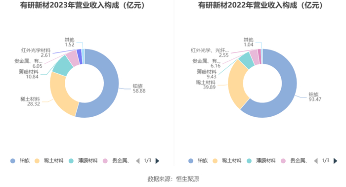 分产品来看,2023年公司主营业务中,铂族收入58.88亿元,同比下降37.01%,占营业收入的54.40%;稀土材料收入28.32亿元,同比下降29.01%,占营业收入的26.17%;薄膜材料收入10.84亿元,同比增长14.97%,占营业收入的10.02%。