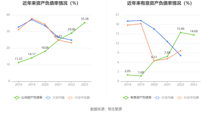 在偿债能力方面,公司2023年年末资产负债率为35.38%,相比上年末上升6.30个百分点;有息资产负债率为14.68%,相比上年末下降0.78个百分点。