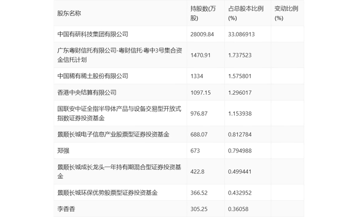 年报显示,2023年年末公司十大流通股东中,持股最多的为中国有研科技集团有限公司,占比33.09%。十大流通股东名单相比2023年三季报维持不变。在具体持股比例上,香港中央结算有限公司、景顺长城电子信息产业股票型证券投资基金、郑强、景顺长城成长龙头一年持有期混合型证券投资基金、景顺长城环保优势股票型证券投资基金持股有所上升,国联安中证全指半导体产品与设备交易型开放式指数证券投资基金、李香香持股有所下降。